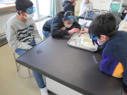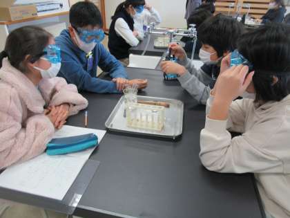 『水溶液には、金属を変化させるものがあるだろうか』を学習課題に実験をしました。子供たちは、酸性の水溶液にはものを溶かす性質があることが分かり、とても驚いていました。