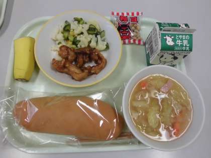 今日の給食は、コッペパン・キャベツスープ・フレンチサラダ・とりにくのマーマレードソースかけ・せつぶん豆・バナナ・牛乳です。とりにくのマーマレードソースかけは、マーマレードの甘さでおいしく味付けされていました。