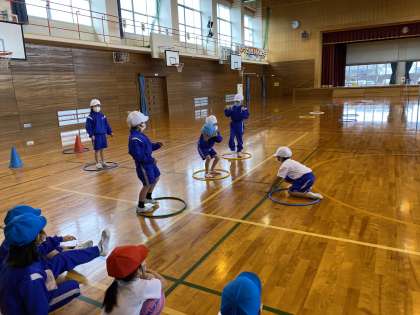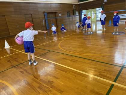 体育でボール投げ遊びをしています。友達のいるところを狙って一生懸命投げたり、高く上がったボールをキャッチしたりして、楽しく取り組みました。どんどん投げ方やキャッチが上手になってきました。