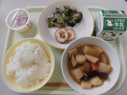 今日の給食は、ごはん、牛乳、野菜の肉巻き、ゆかり和え、おでん、納豆です。