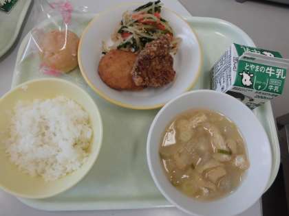今日の給食は、ごはん・牛乳・みそしる・ごま和え・豚肉の竜田揚げまたは、えびかつ・いちごのシュークリームまたはハチミツレモンゼリーです。今日は選択献立でした。豚肉の竜田揚げといちごのシュークリームを選んでいる子供たちが多かったです。どちらの献立もおいしそうですね。
