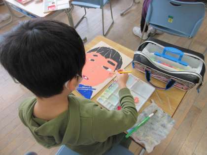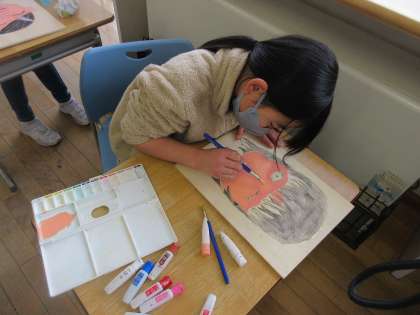 今日は、彫刻刀で彫ったベニヤ板に絵の具で色を塗りました。画用紙とは違った質感を感じながら、自分の顔や服の色を考えながら着色しました。色を混ぜ合わせながら、自分の塗りたい色を探していました。