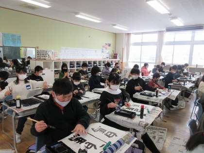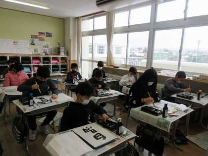 書写の時間は、姿勢を正し、手本をよく見て書いています。今日は二つの字のバランスを考えながら練習しました。