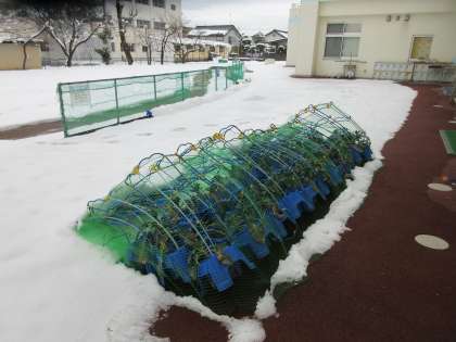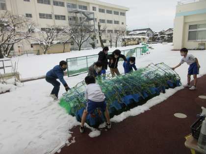 朝、登校してみるとブロッコリーの鉢が、雪の重さや風のせいでなぎ倒されていました。先日、鳥対策のネットをかけたばかりなのに・・・。子供たちも見つけて「ブロッコリー作戦」が開始されました。みんなで力を合わせて、ブロッコリーの鉢を必死で元に戻しました。みんなで自然の力のすごさを実感しました。