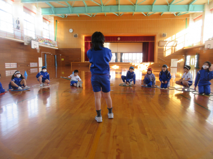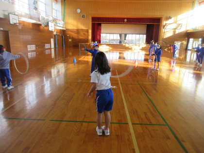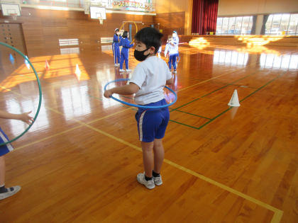 体育では、フラフープを使って体を動かしました。フラフープを回したり、投げたり、キャッチしたり…。フラフープを使って楽しく運動することができました。
