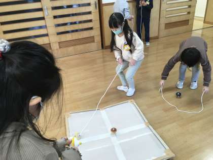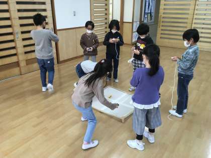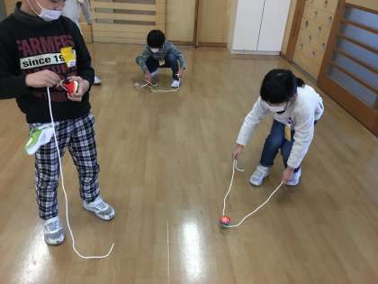 休み時間にこまやけん玉を使って遊んでいます。みんなで仲良く楽しみました。