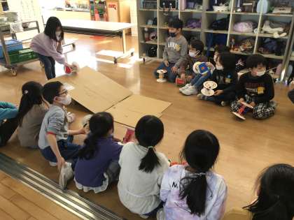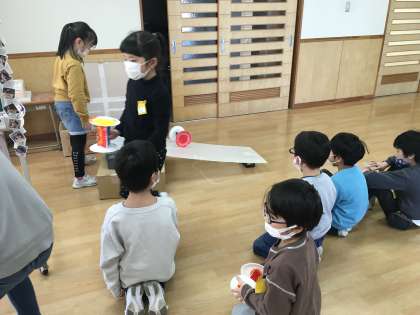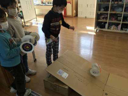 図工の学習でかみざらコロコロを作りました。紙皿などに模様や飾り付けをして、コロコロ回ったときの動きや色を楽しみました。