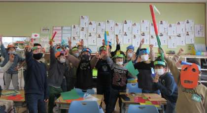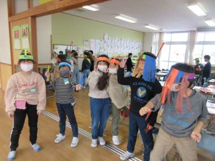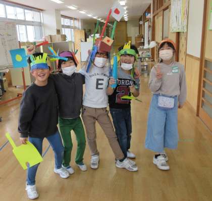 ちぎり絵版画の版ができた人から、紙の輪っかをベースに冠を作りました。思い思いの飾りを厚紙で作って貼り付け、とても楽しい作品となりました。明日の「おもちゃまつり」では、この冠をかぶって1年生を出迎えます。