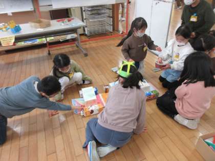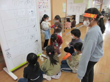 今日は、待ちに待った1年生さんを招待する「おもちゃまつり」。2年生の「おもちゃまつりスタート!」の掛け声で、一斉におもちゃの店がオープンしました。1年生にやり方やルールを教える姿、高得点が出たら一緒に喜ぶ姿、自分から店に誘う姿など、一生懸命1年生をもてなそうとしていました。