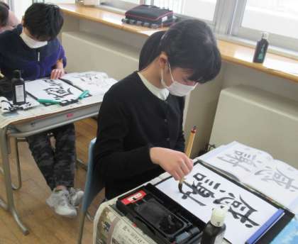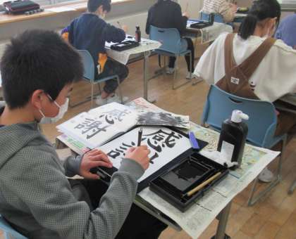 子供たちは、「今まで書いた文字と違って、画数が多くて難しい」と言いながら、一生懸命取り組んでいました。