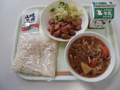 今日の給食は、ソフト麺、五目あん、ごまだれポテト、切り干し大根のドレッシング和え、味付け小魚、牛乳です。
