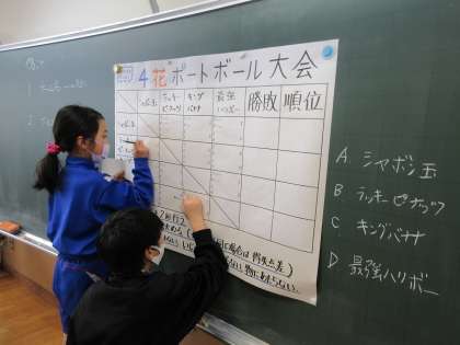ポートボール大会に向けて、今日はチーム名と3試合目までのゴールマン・ガードマンを決定しました。そして、大会に向けての練習試合をしました。パスを上手に渡すためにどのように動けばよいのかを考えるよい経験になったことでしょう。次回から大会が始まります。