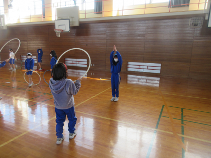 体育科ではフラフープを使ってたくさん体を動かしました。フラフープをキャッチしたり真ん中の部分をジャンプして進んだり、色々な運動を楽しみながら活動しました。