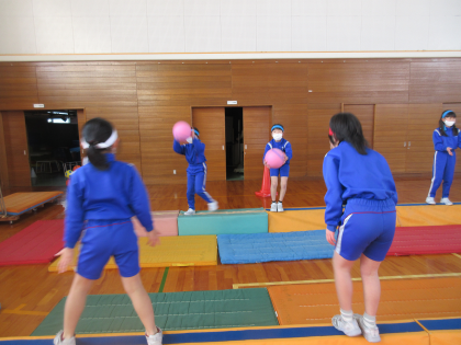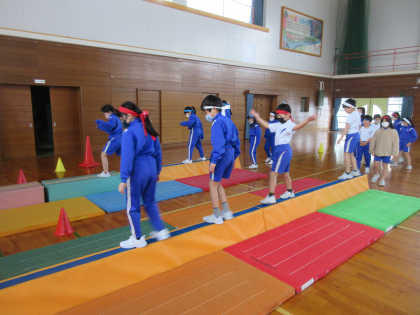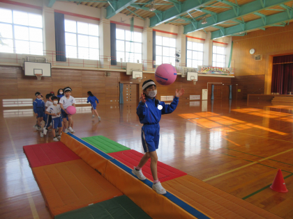 体育科では、平均台を使って体のバランスをとる運動をしました。平均台を色々な歩き方で渡り、頑張ってバランスをとっていました。ボールをキャッチしながら渡るという技にもチャレンジしました。