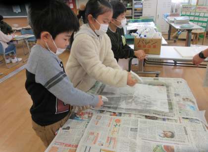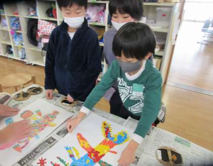 1月から制作してきた「ちぎり絵版画」を刷りました。生活班で協力して、和紙に水をふけたり、バレンで押さえたりして仕上げました。出来上がった作品を見て、みんな大歓声をあげていました。