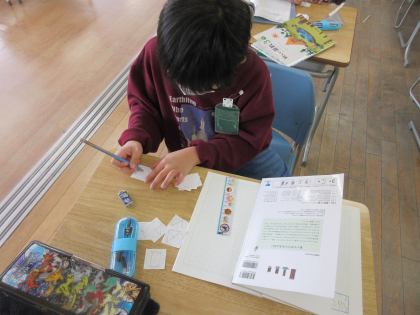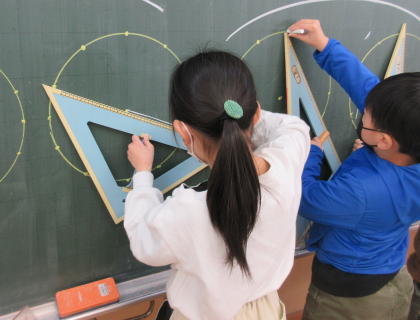 算数科では、「三角形と角」の学習がスタートしました。今日は色々な三角形を描いた後、それぞれの辺の長さで三角形の仲間分けをしました。今日は新たに「二等辺三角形」「正三角形」を学習しました。