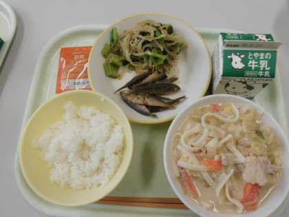 今日の給食は、ごはん、牛乳、こあじの唐揚げ、なばなひたし、白ごま豆乳うどん、穀物ふりかけです。