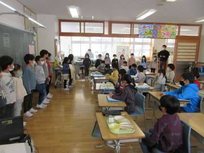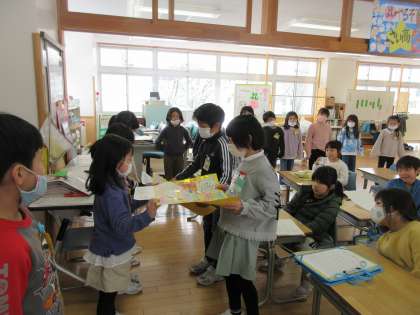 1年生さんが「おもちゃまつり」のお礼に来られたよ(2年生)
