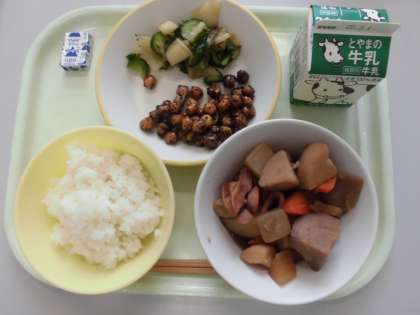 今日の給食は、ごはん・牛乳・いかとさといもの煮物・昆布和え・梅フライビーンズ・ポケットチーズです。梅フライビーンズはカリカリでとてもおいしかったです。煮物もいかのうまみがきいていました。