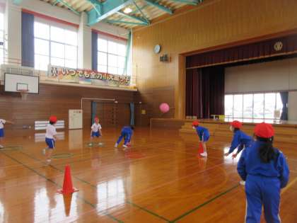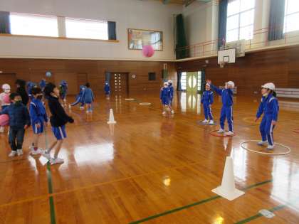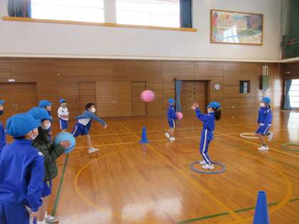 体育でやっていた「キャッチバレー」をいよいよ対戦形式で行いました。それぞれの団で2チームに分かれてゲームを楽しみました。