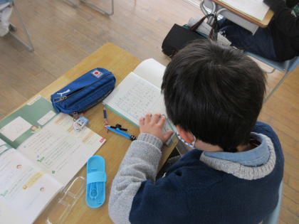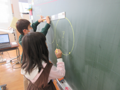 算数科では、コンパスで描いた円を使って、二等辺三角形や正三角形を描きました。三角形の辺と円の半径との関係を考え、三角形の描き方を学習しました。