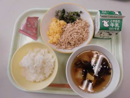 今日の給食は、ごはん、牛乳、そぼろどん(とりそぼろ、いりたまご)、よごし、すまし汁、ひなあられです。