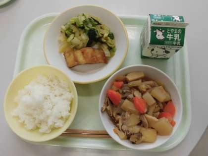 今日の給食は、ごはん、揚げ魚のレモン味、はくさいひたし、大和煮、牛乳です。