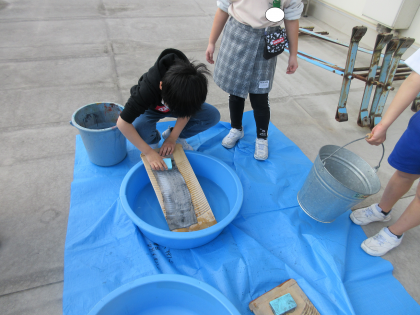 社会科では、洗濯板を使って実際に洗濯をしてみました。子供たちは、布の汚れを見付けると、頑張って泡立て、もみ洗いをしました。感想を聞くと、「手・足・腰が結構疲れた」「昔の人の大変さを感じた」「汚れが落ちる様子がよくわかった」など様々な意見がありました。昔の人の生活を少し体験することができました。