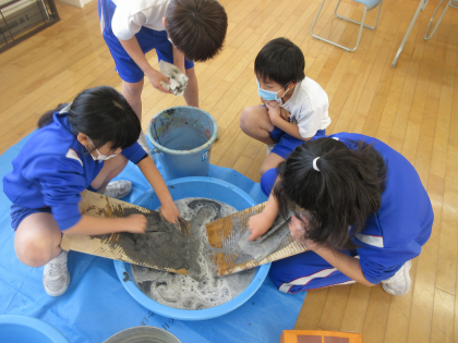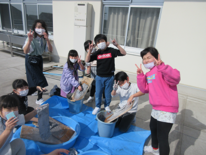 社会科では、洗濯板を使って実際に洗濯をしてみました。子供たちは、布の汚れを見付けると、頑張って泡立て、もみ洗いをしました。感想を聞くと、「手・足・腰が結構疲れた」「昔の人の大変さを感じた」「汚れが落ちる様子がよくわかった」など様々な意見がありました。昔の人の生活を少し体験することができました。