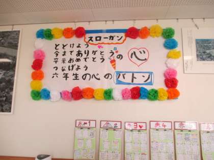3月4日(金)の卒業お祝い集会に向けて、各学年では本格的に練習や準備が始まっています。今日は、児童玄関前には完成したスローガンを掲示しました。また、司会、始め・終わりの言葉チームとゲームチームが体育館で練習しました。スローガンのように、「今までありがとう 卒業おめでとう」の気持ちが伝わるようにがんばります!!