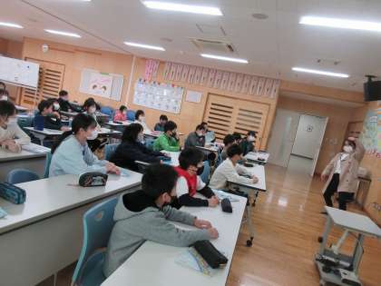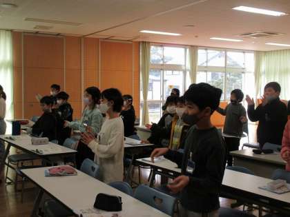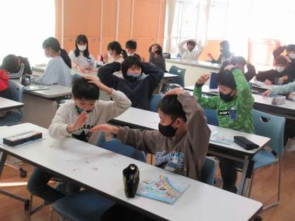 今日の外国語活動は、前回学習した日課の言い方を復習しました。朝起きてから、夜寝るまでの行動をジェスチャー付きで覚えました。その後、ALTの先生が話す言葉を聞いたり、ジェスチャーを見たりしてカードを取るゲームを楽しみました。