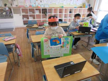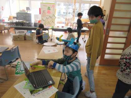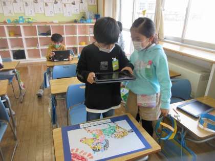 3学期制作した制作した「ちぎり絵版画」「わっかでへんしん!」「まどからこんにちは」をタブレットで撮影しました。みんな名カメラマンになった気分で針蹴って活動していました。