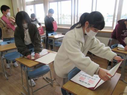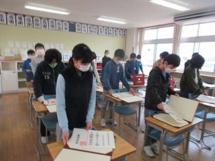 今日は、卒業証書を証書フォルダに入れる練習をしました。