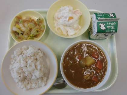 今日の給食は、麦ごはん、牛乳、カレー、ふくじんあえ、フルーツヨーグルトです。