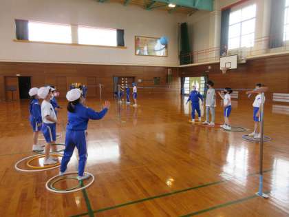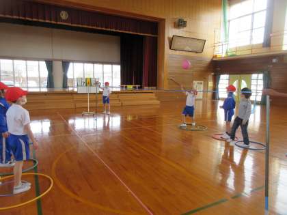 今回のキャッチバレーは、受けた数を得点にして、団ごとに競い合いました。相手が受けやすい球を工夫するうちに「いくよー」「ナイス」「やったね」とふわふわ言葉が、各団で飛び交って気持ちのよいゲームとなりました。