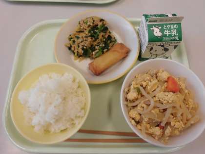 今日の給食は、ごはん、牛乳、親子煮、はるまき、なっとうあえです。