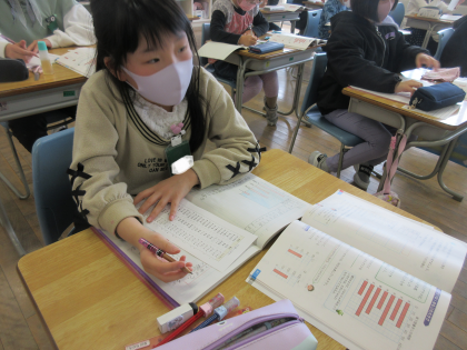 算数科では、わかりやすく整理するための方法として棒グラフを学習しています。棒グラフにも、縦や横になっているものや1めもりの表し方が違っているものなど、様々な種類があることを学習しました。