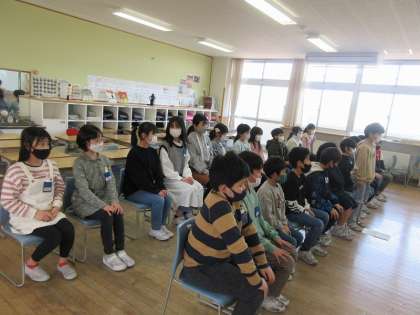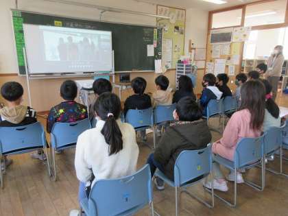 在校生が卒業式に参列できないため、リモートで「お別れの会」を行いました。在校生からのエールは、4年生が中心となって行いました。子供たちは、がんばっている姿を6年生に見てもらいたいと、一生懸命がんばりました。真剣な態度で臨む姿から、5年生への意気込みを感じました。