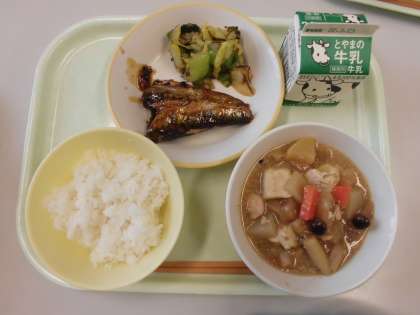 今日の給食は、ごはん、牛乳、鶏肉と根菜のごま煮、いわしの生姜味、昆布和えです。
