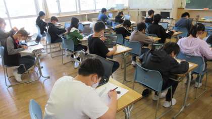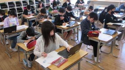 花のデッサンに挑戦しました。玄関の花やグラウンドの桜をよく見て鉛筆で描きました。細い線を重ねて、筋や影をつけ、粘り強く描きました。