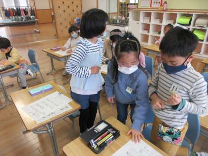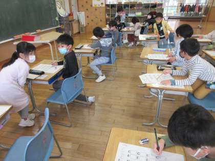 生活科で「1花なかよし!大作戦」をしました。お友達の名前の一番上の字をワークシートに書き込んでいこうという活動です。お友達の座席に行って、名前カードを見せてと頼んだり、下の名前を写したりして、仲良く活動を進めていました。