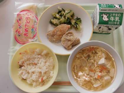 4月18日(月)の給食 公開日 2022/04/19 更新日 2022/04/19 活動の様子 今日の献立は、「入学お祝い献立」です。ちらし寿司・牛乳・とりにくのからあげ・チンゲンサイひたし・かき玉汁・おいわいデザートです。
