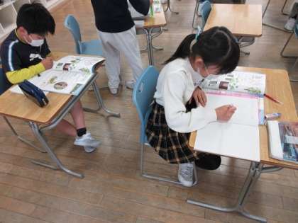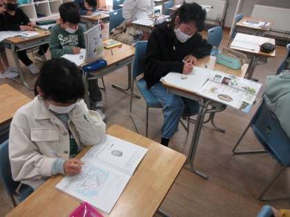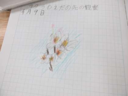 理科の授業の様子です。本物の桜が残念ながら散ってしまったので教科書の桜の写真を見て、スケッチをしています。