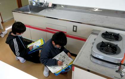 家庭科の学習を行いました。家庭科ではどんな勉強をするか説明を聞いたり、家庭科室を探検したりしました。