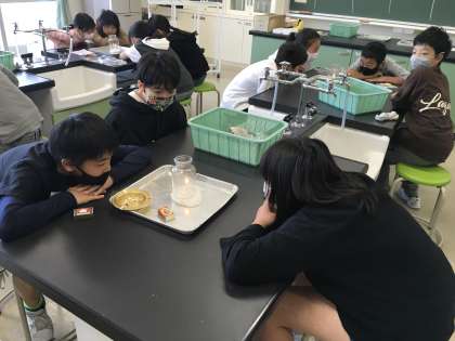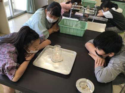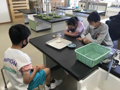 理科の学習で物が燃え続けるための条件を調べました。マッチに火を付けることに悪戦苦闘しながらしっかりと実験・観察を行いました。
