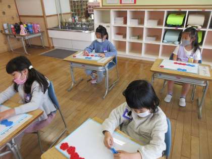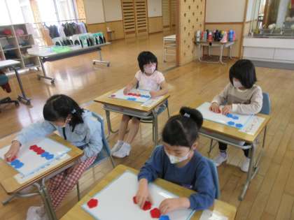 「5はいくつといくつ」の第2弾、おはじきを使って数の感覚を身に付ける活動を行いました。一人一人が実際に数を数えながらおはじきを動かしていきました。