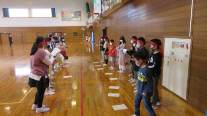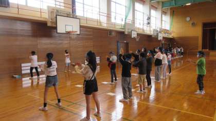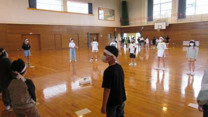 運動会の応援練習を行っています。6年生が中心となって、応援の振り付けや歌詞を5年生に伝えました。5年生も6年生の話をしっかり聞いて声を出したり、体を動かしたりしていました。