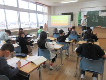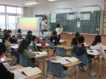 漢字の成り立ちについて学習しました。象形文字のクイズに答えたり、組み合わせてできた漢字について意味を調べたりしました。