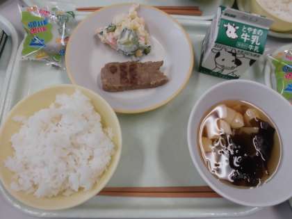 今日の給食は、ごはん・牛乳・わかたけ汁・ポテトサラダ・鯉のぼりハンバーグ・かしわもちです。今日はこどもの日献立です。ハンバーグは鯉のぼりの形をしています。かわいいですね!子供たちは、「なんだこれー!」と興味津々でした。かしわもちも子供たちに人気でした。