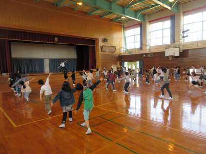 4年生と一緒にダンスの練習をしました。子供たちはノリノリで楽しそうに、元気いっぱい踊りました。